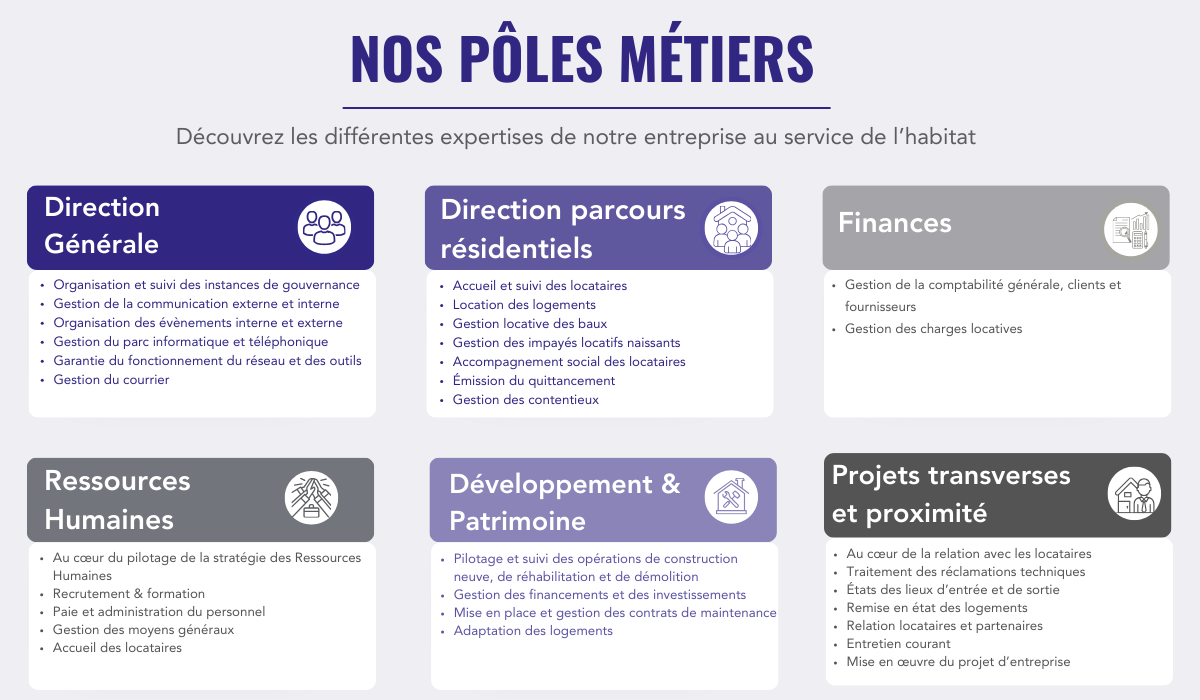 Loge.GBM réunit une diversité de métiers et de compétences couvrant la construction, l'attribution, la maintenance et l'accompagnement social.